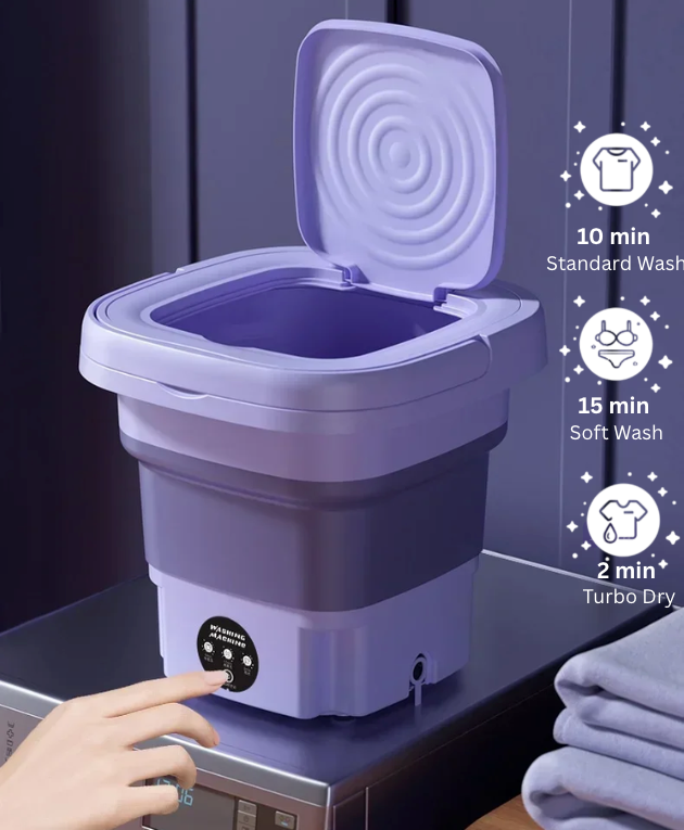 FreshSpin holds up to 8 litres of water, perfect for a few shirts, underwear, or small loads—ideal for apartments, dorms, or travel.
